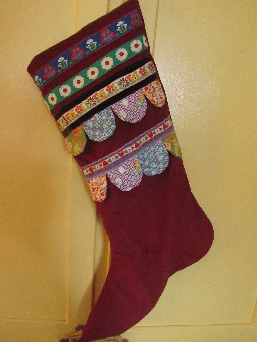 I'm here today to present to you Miss Oona's handmade sugar plum fairy stocking, made by Mama, of course. Okay, there's no fireplace mantel to hang this stocking, but we'll find a place for it, I'm sure. It's made out of red corduroy with blue corduroy lining. I got to use some of my stash of fun vintage embroidery ribbon. Oona seemed to really dig the owl's. I let the owner try it out, and she seemed to approve. In fact, it might have even gotten a few "ooo's" out of the girl. It's so nice to have your work appreciated. The size of the stocking was perhaps a bit ambitious. Santa's going to have to work overtime to fill this one. Mommy tried it on and an adult foot fits comfortably in it, with room to spare.