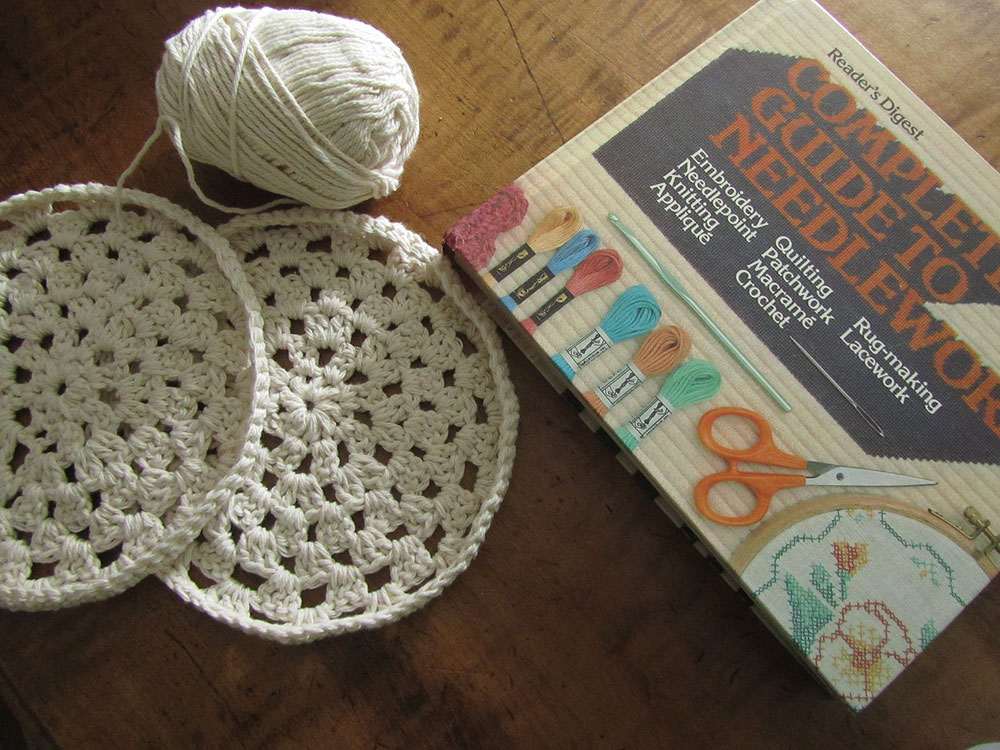 It's been a long weekend. My babe would have me turning cartwheels if she could. Instead, I'm turning "wagon wheels" with my crochet hook whenever she's not looking. I made a couple of new cotton dish clothes for the kitchen... mostly when she was napping. The house is in a state of utter decay. I can't seem to find time to sew, cook, clean, or sleep. The babe is engaging in heightened levels of daredevil activity, and I am on duty 24/7.